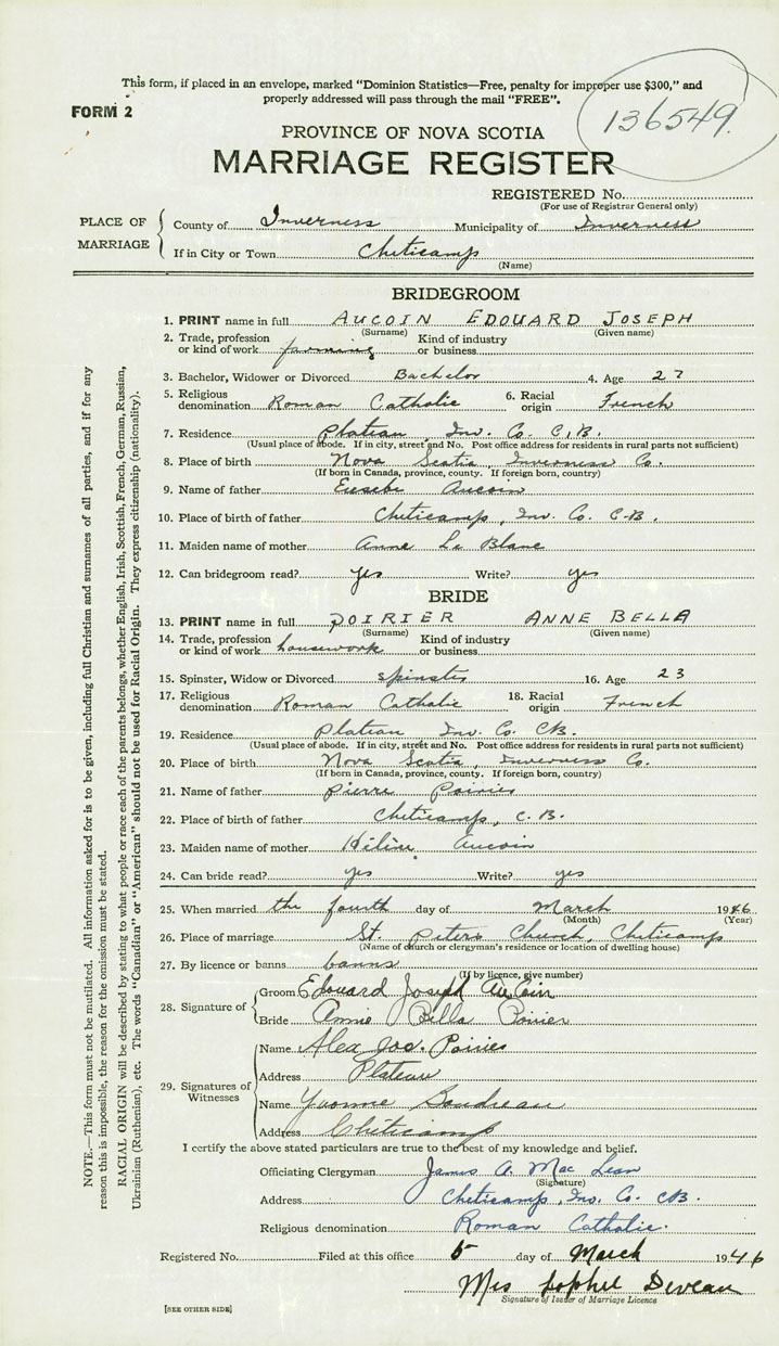 PLACE OF MARRIAGE County of Inverness in City or Town Cheticamp
