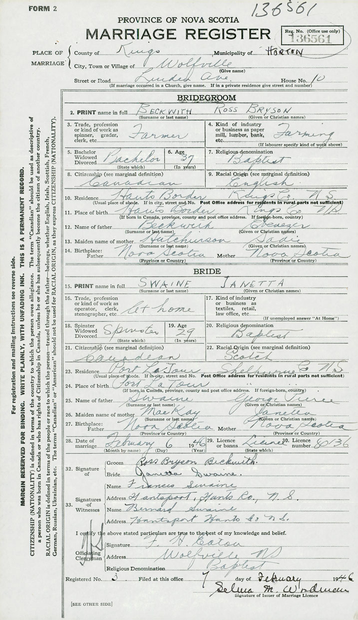 28. Date of marriage February 6 1946 29. By license or banns License 30. License number 80136