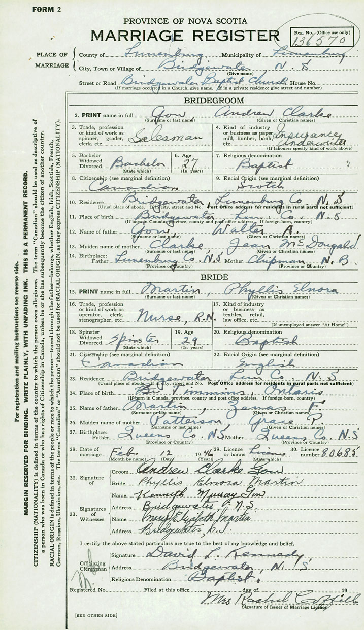 28. Date of marriage February 12 1946 29. By license or banns License 30. License number 80685