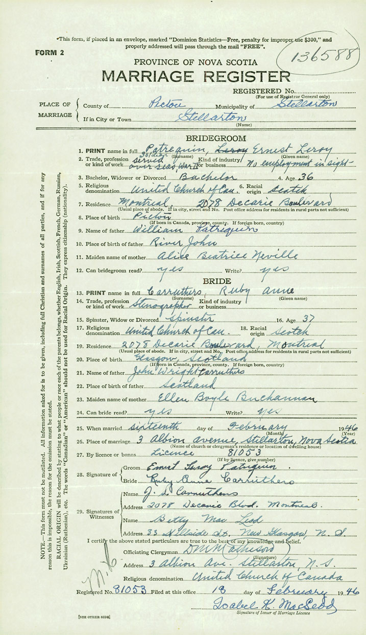 26. Place of marriage 3 Albion Ave. Stellarton, Pictou County
