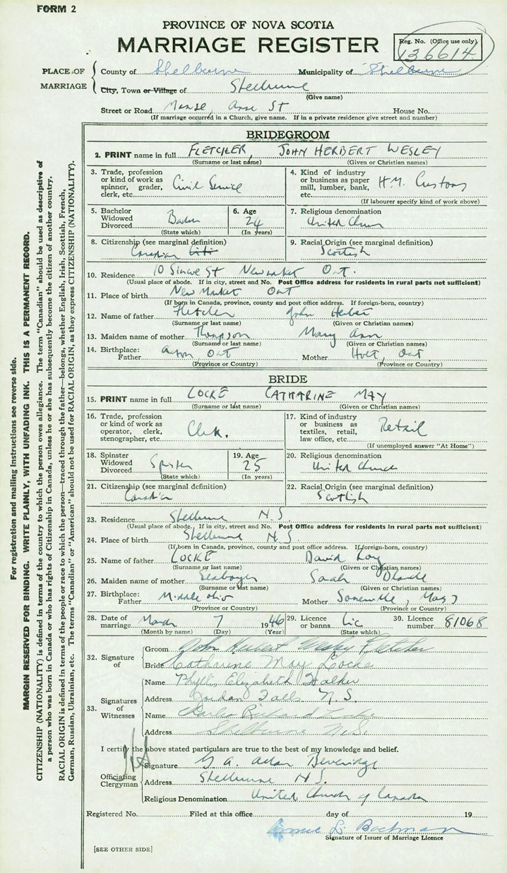 28. Date of marriage March 7 1946 29. By license or banns License 30. License number 81068