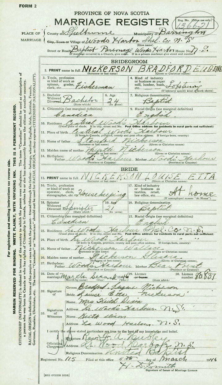 24. Place of birth Lower Woods Harbour