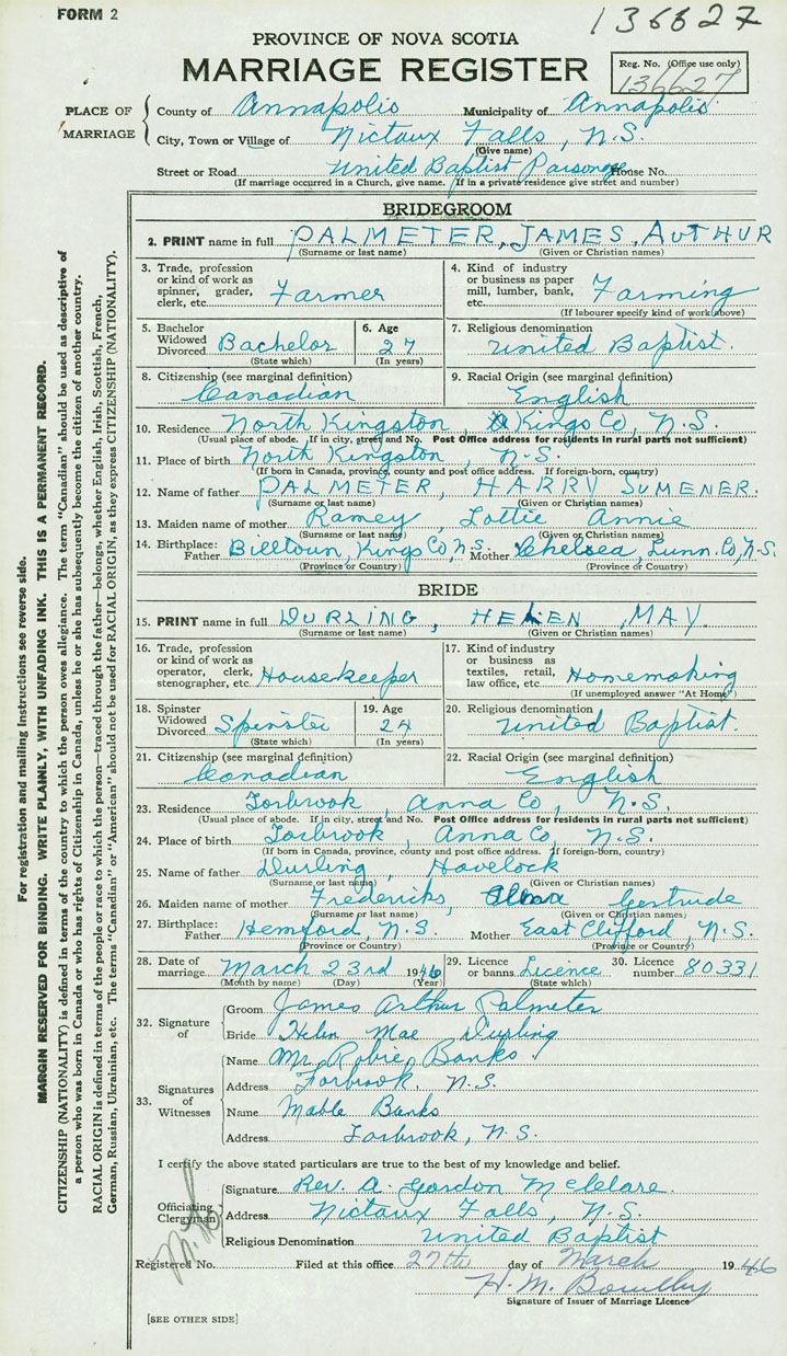 28. Date of marriage March 23 1946 29. By license or banns License 30. License number 80331