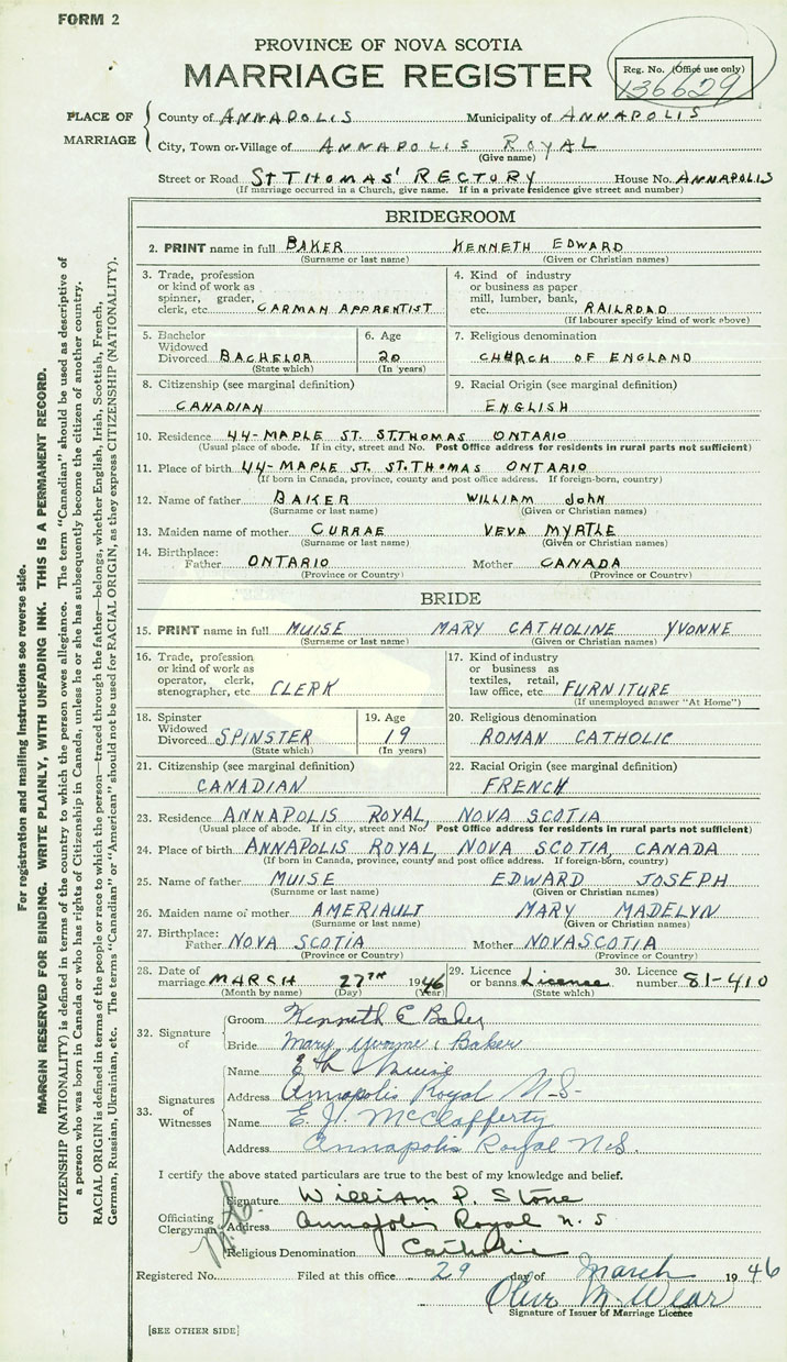 28. Date of marriage March 27 1946 29. By license or banns License 30. License number 81-410