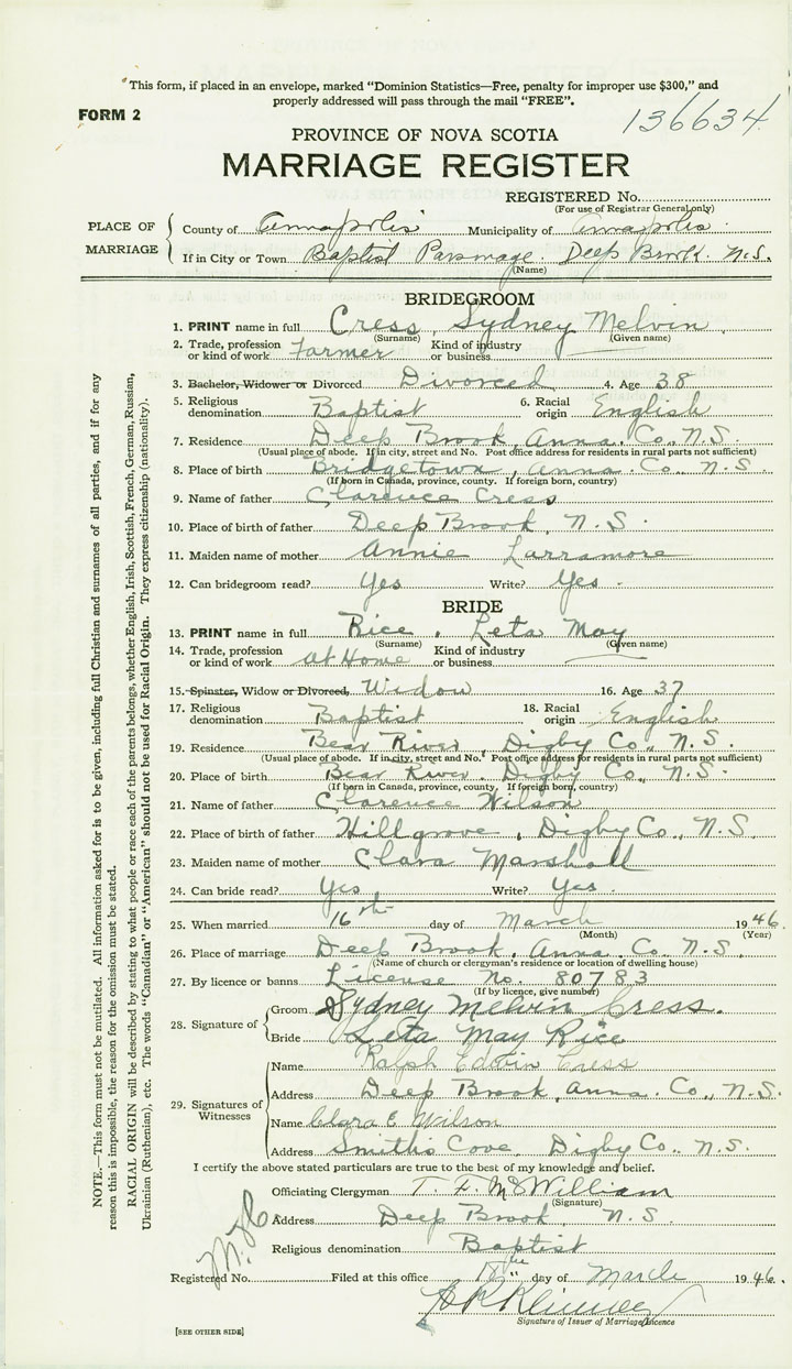 PLACE OF MARRIAGE County of Annapolis in City or Town Deep Brook