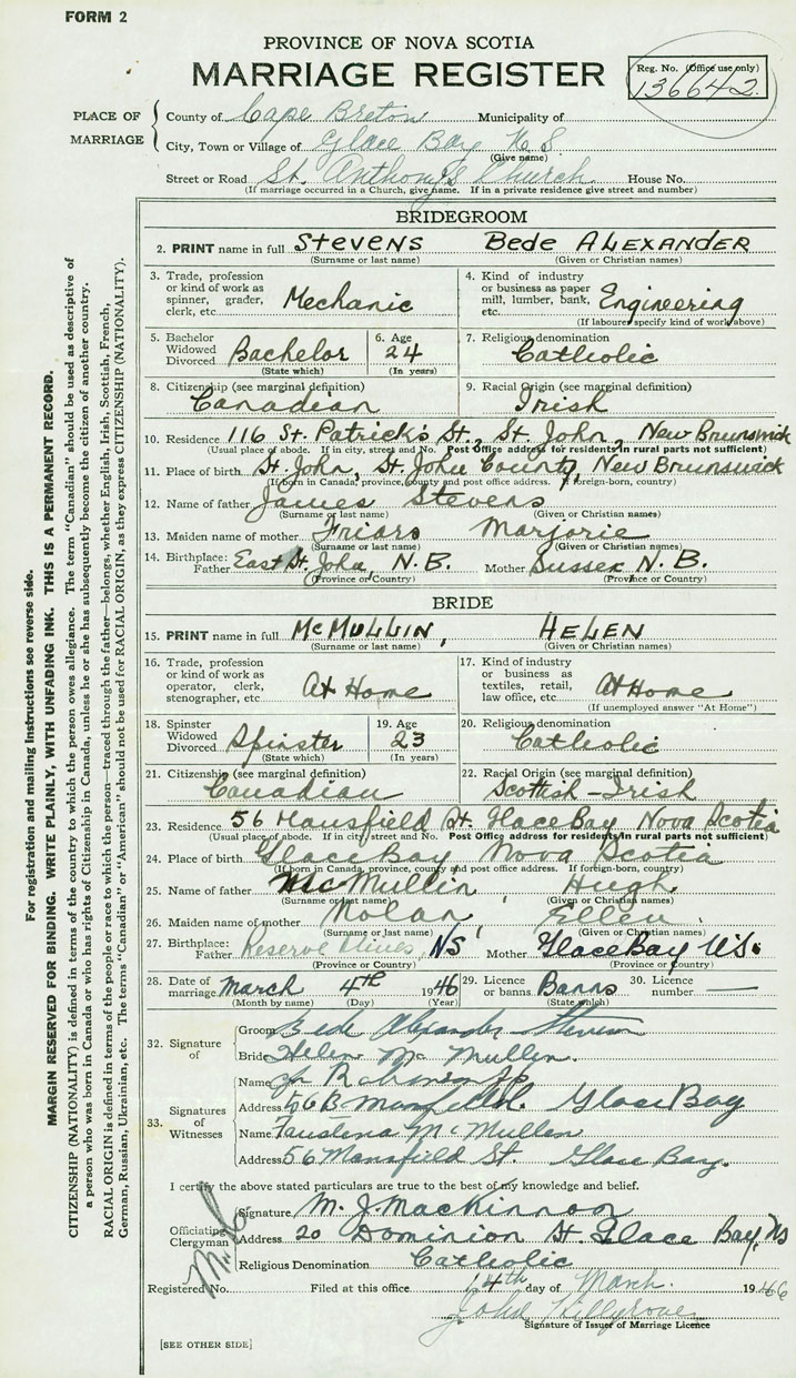 28. Date of marriage March 4 1946 29. By license or banns License 30. License number