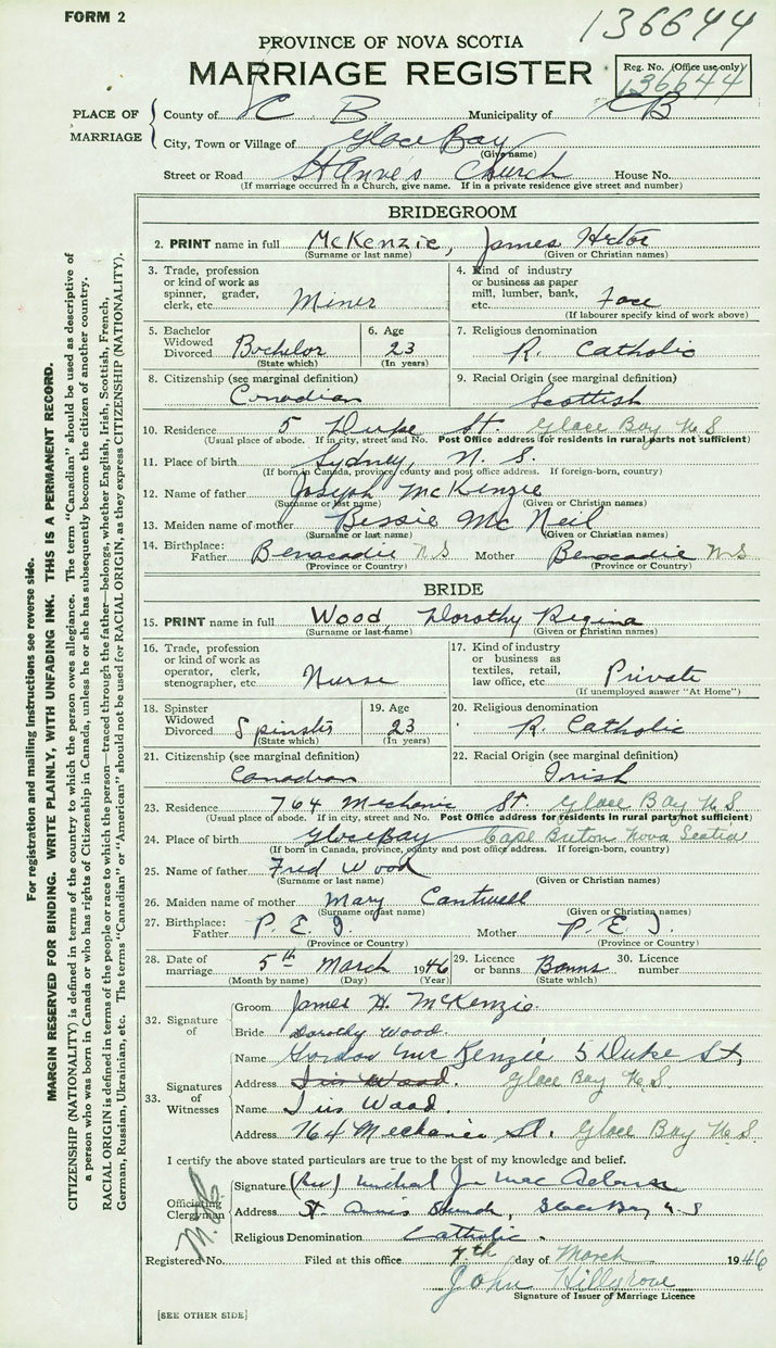 28. Date of marriage March 5 1946 29. By license or banns License 30. License number