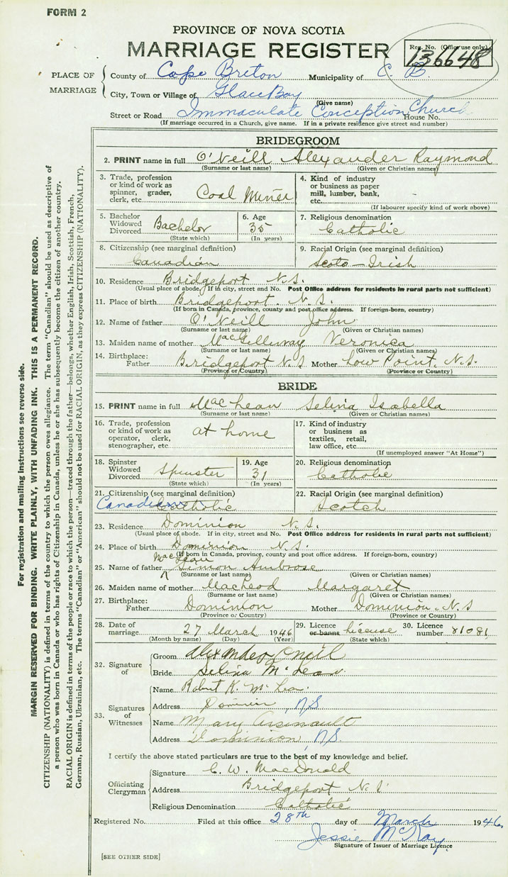 28. Date of marriage March 27 1946 29. By license or banns License 30. License number 81081