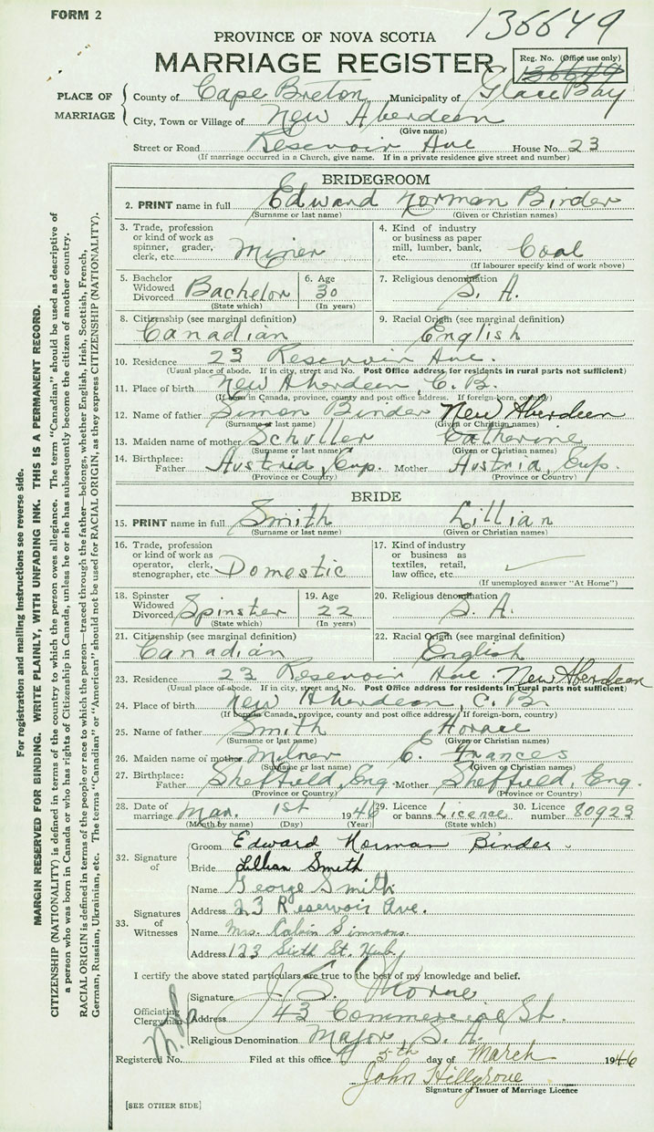 28. Date of marriage March 1 1946 29. By license or banns License 30. License number 80923