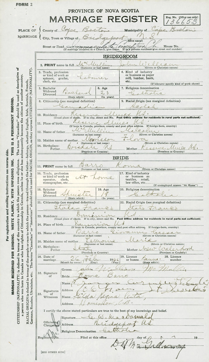 28. Date of marriage February 26 1946 29. By license or banns Banns 30. License number Banns