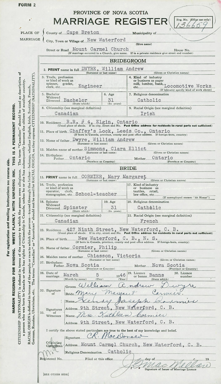 28. Date of marriage March 5 1946 29. By license or banns License 30. License number