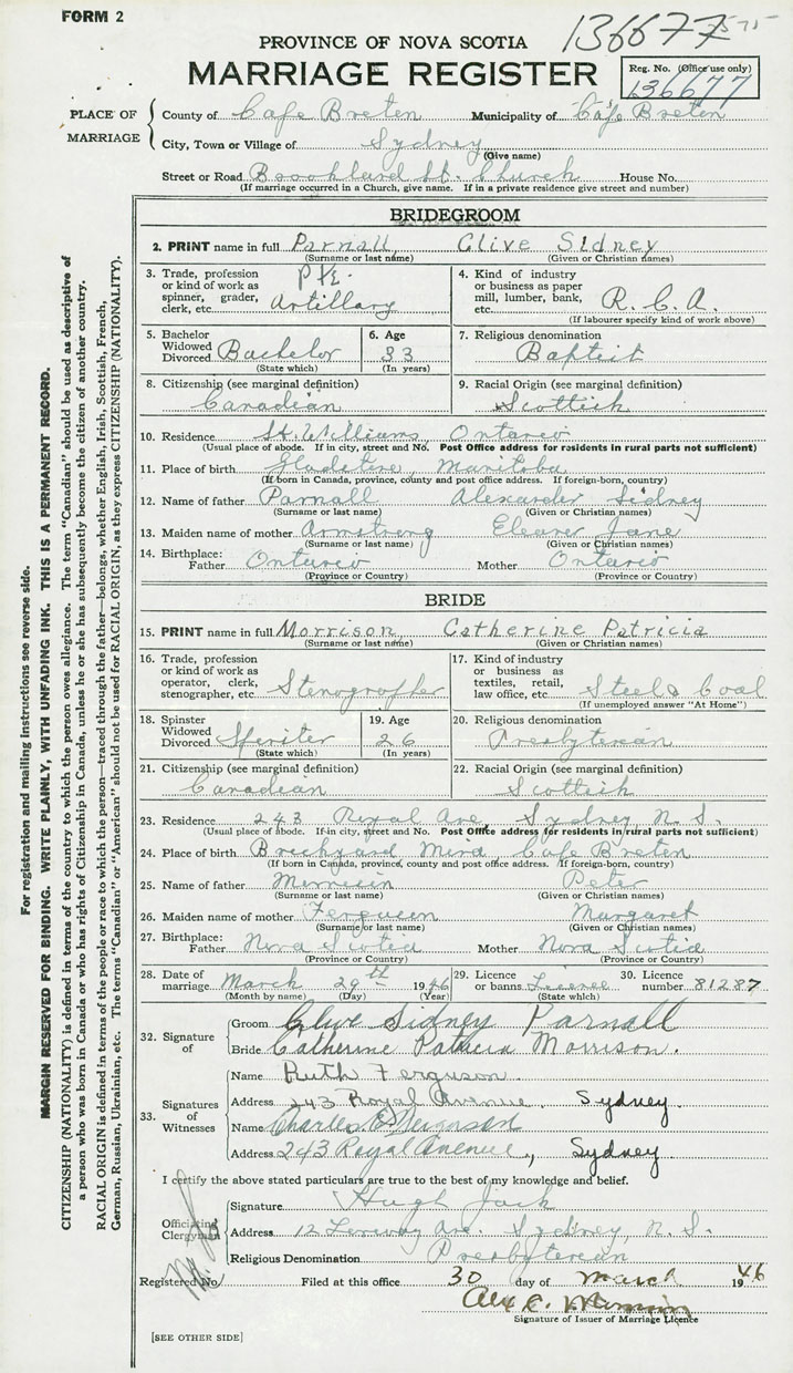 28. Date of marriage March 29 1946 29. By license or banns License 30. License number 81287