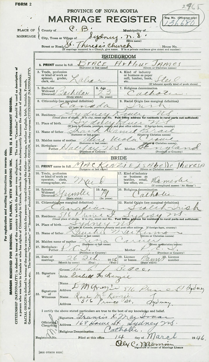 28. Date of marriage February 26 1946 29. By license or banns License 30. License number