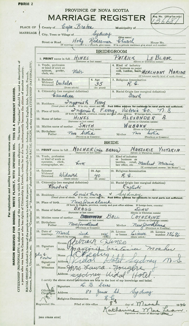 28. Date of marriage March 2 1946 29. By license or banns License 30. License number 75696
