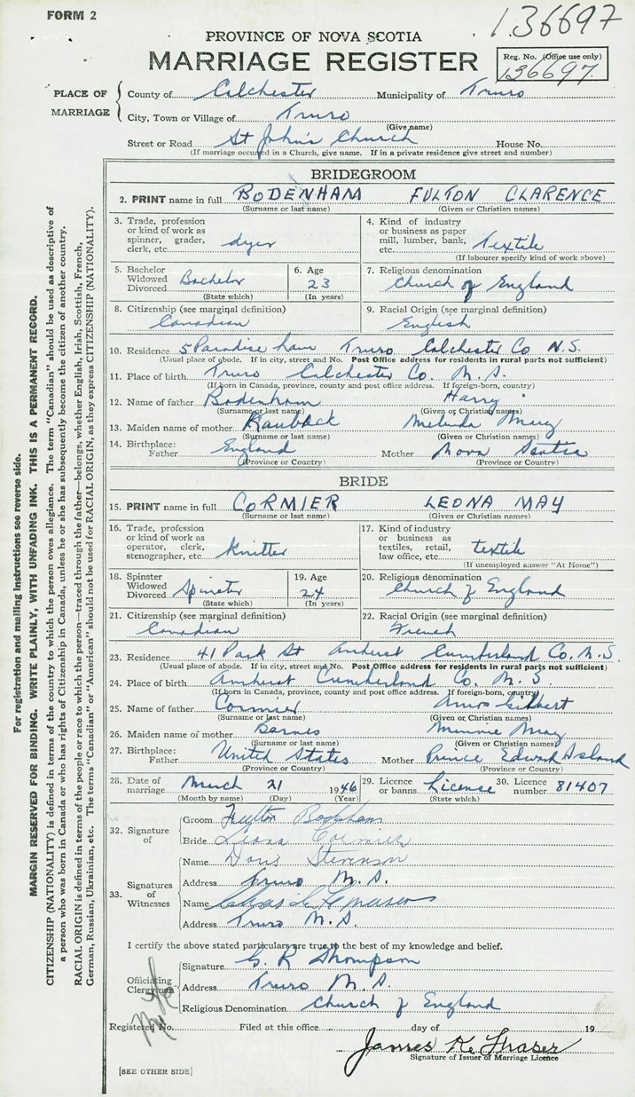 28. Date of marriage March 21 1946 29. By license or banns License 30. License number 81407