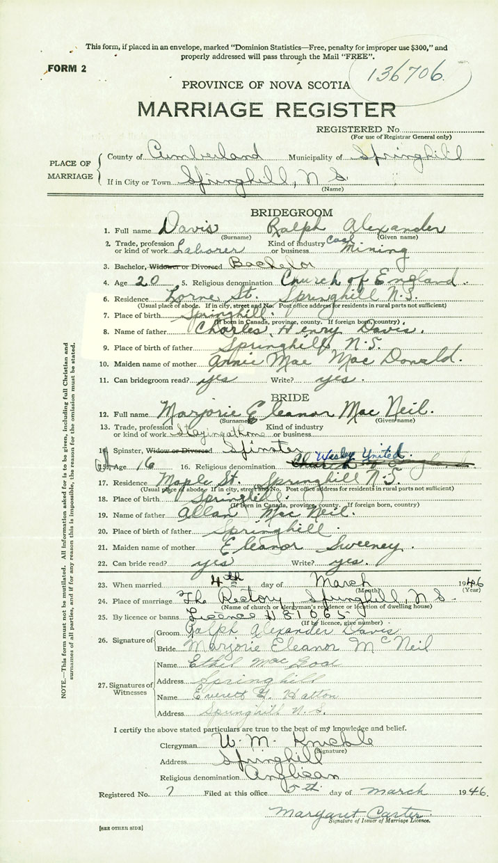 PLACE OF MARRIAGE County of Cumberland in City or Town Springhill