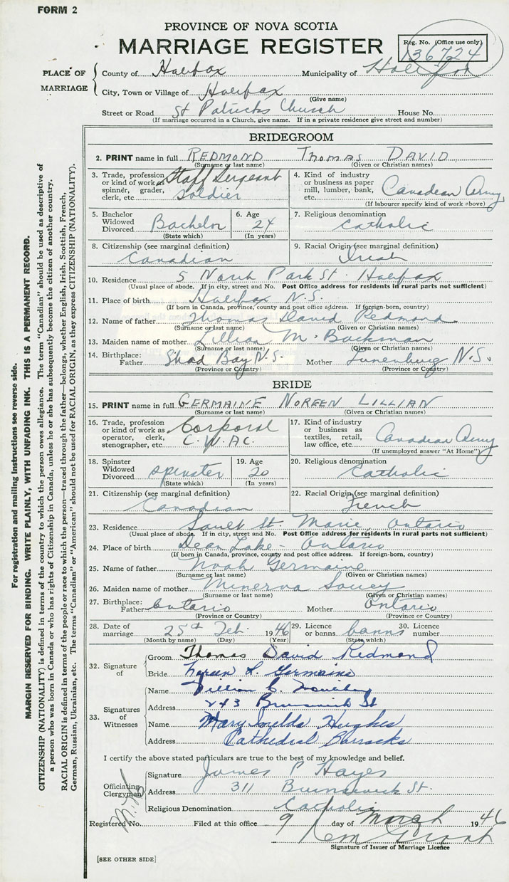 28. Date of marriage February 25 1946 29. By license or banns License 30. License number