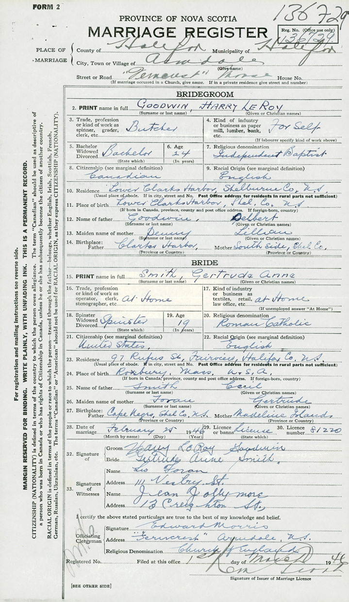 28. Date of marriage February 25 1946 29. By license or banns License 30. License number 81220