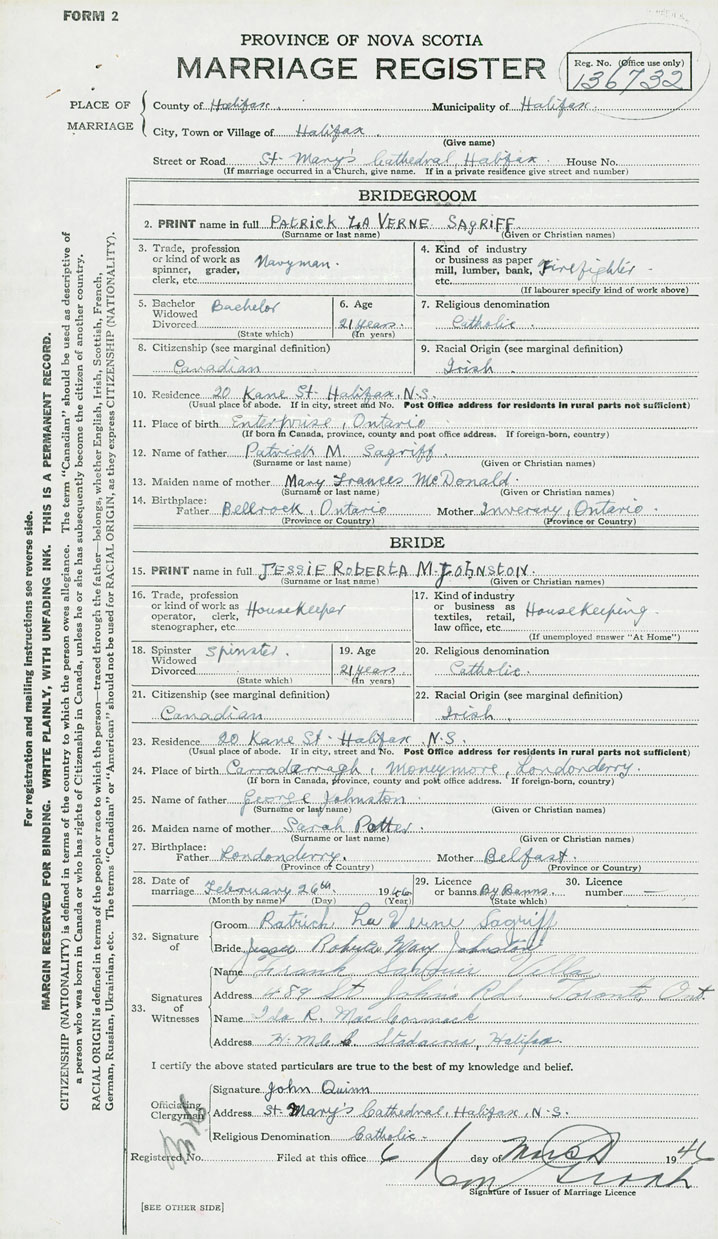 28. Date of marriage February 26 1946 29. By license or banns License 30. License number