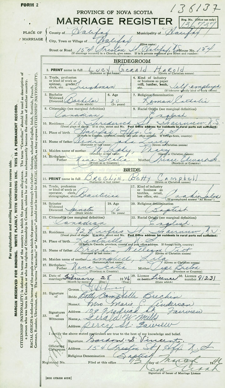 28. Date of marriage February 28 1946 29. By license or banns License 30. License number 81231