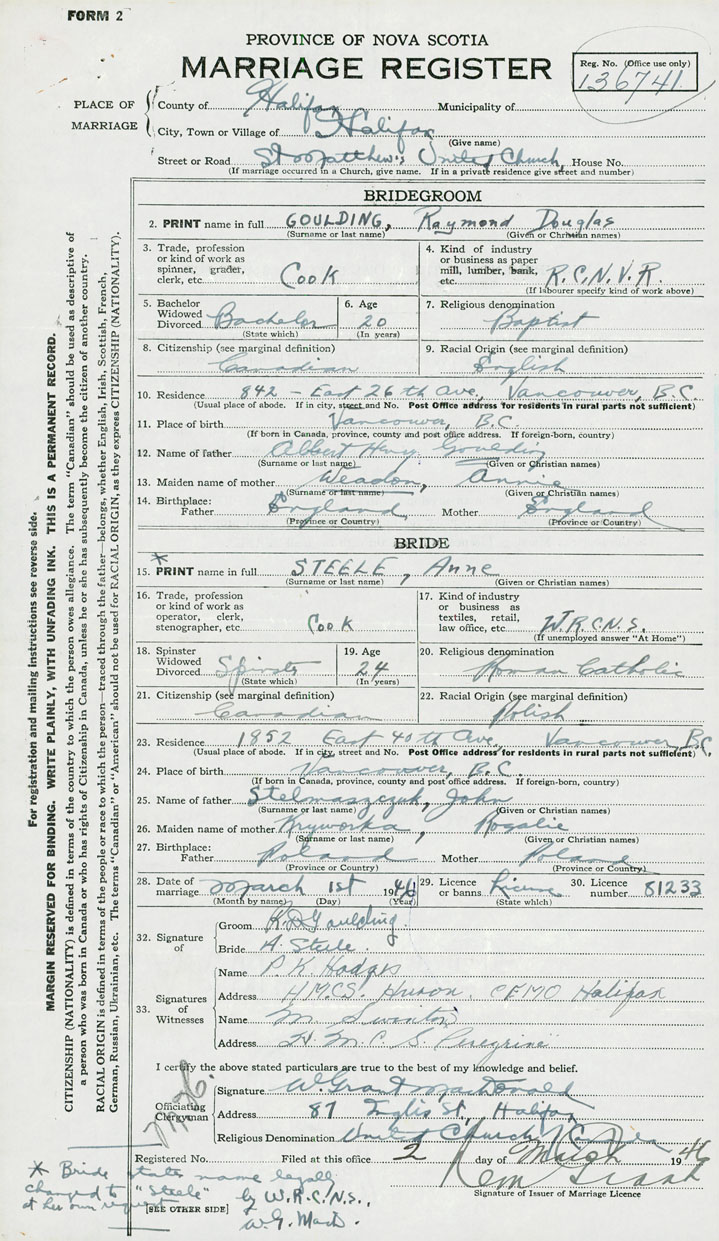 28. Date of marriage March 1 1946 29. By license or banns License 30. License number 81233
