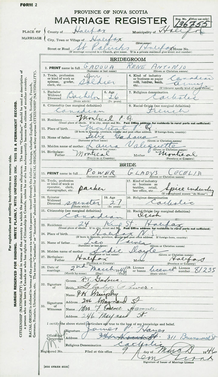 28. Date of marriage March 2 1946 29. By license or banns License 30. License number 81235