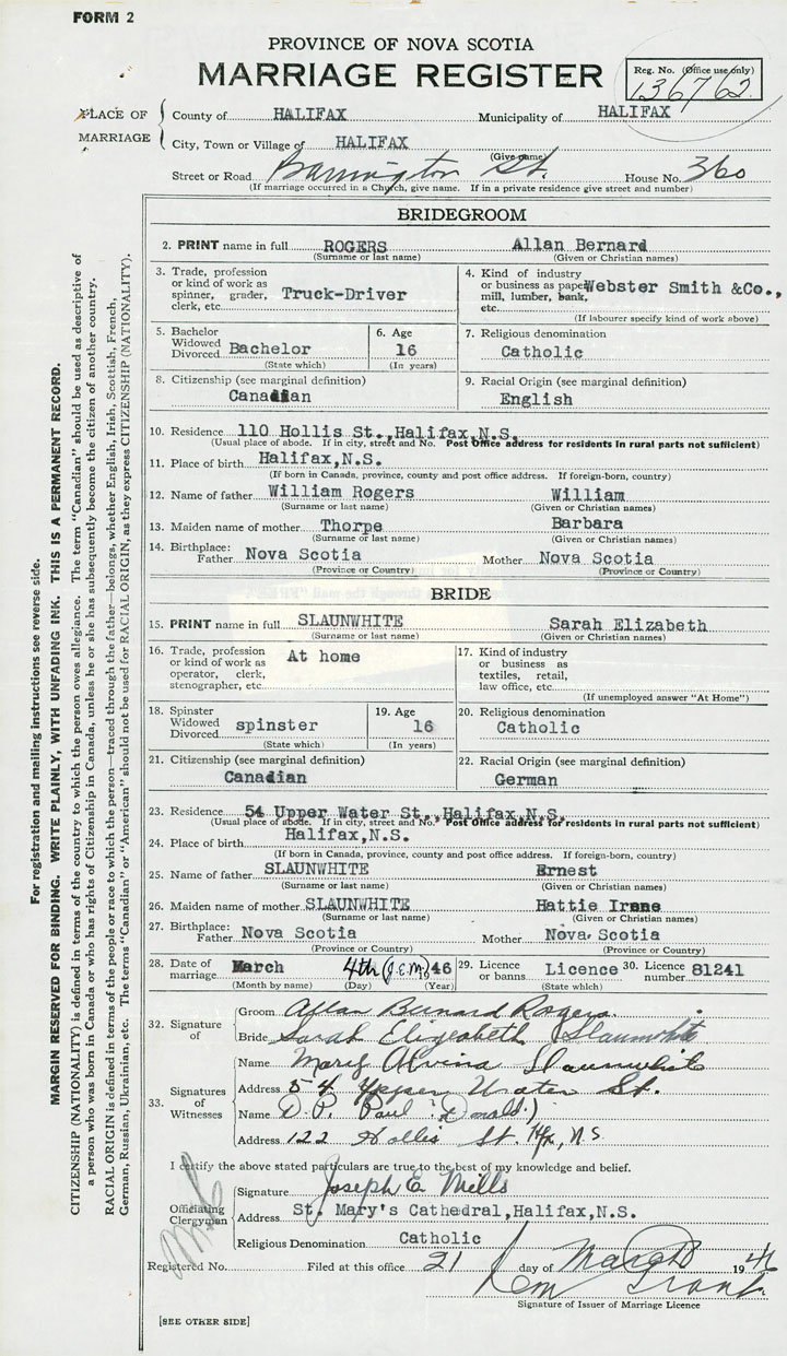 28. Date of marriage March 4 1946 29. By license or banns License 30. License number 81241