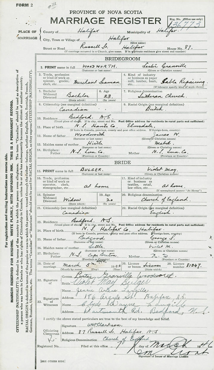 28. Date of marriage March 5 1946 29. By license or banns License 30. License number 81347