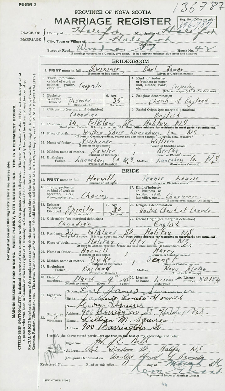 Groom Earl James Swinimer