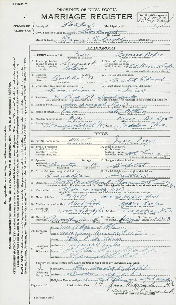 28. Date of marriage March 12 1946 29. By license or banns License 30. License number 81353