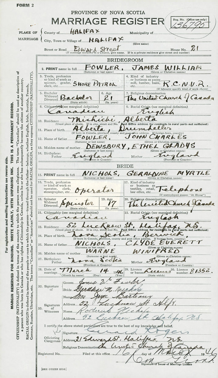 28. Date of marriage March 14 1946 29. By license or banns License 30. License number 81352