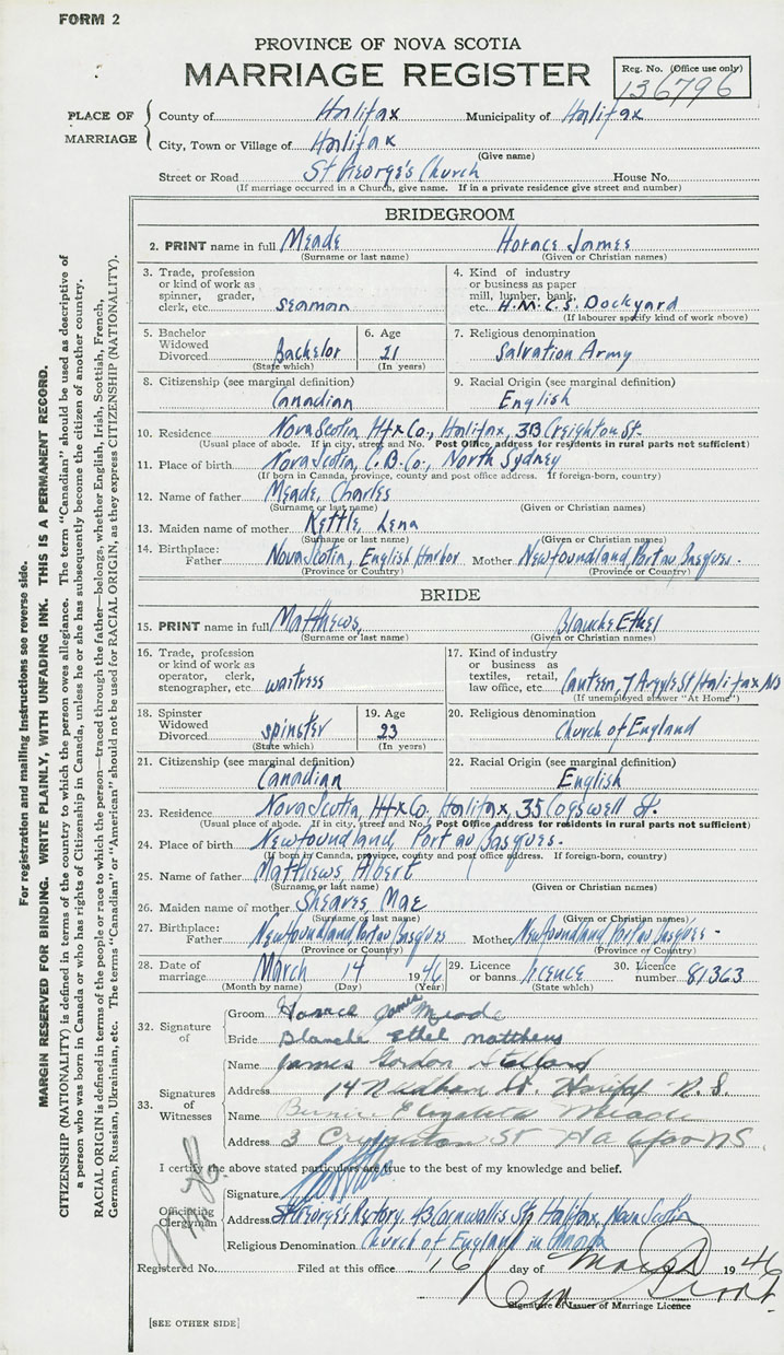 28. Date of marriage March 14 1946 29. By license or banns License 30. License number 81363