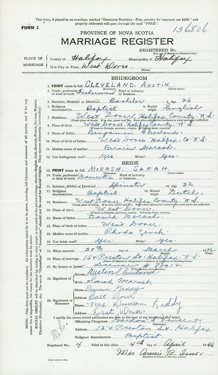 26. Place of marriage 154 Preston St. West Dover, Halifax County