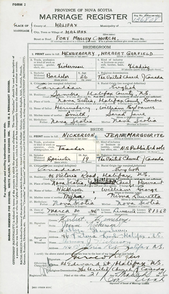 28. Date of marriage March 20 1946 29. By license or banns License 30. License number 81368