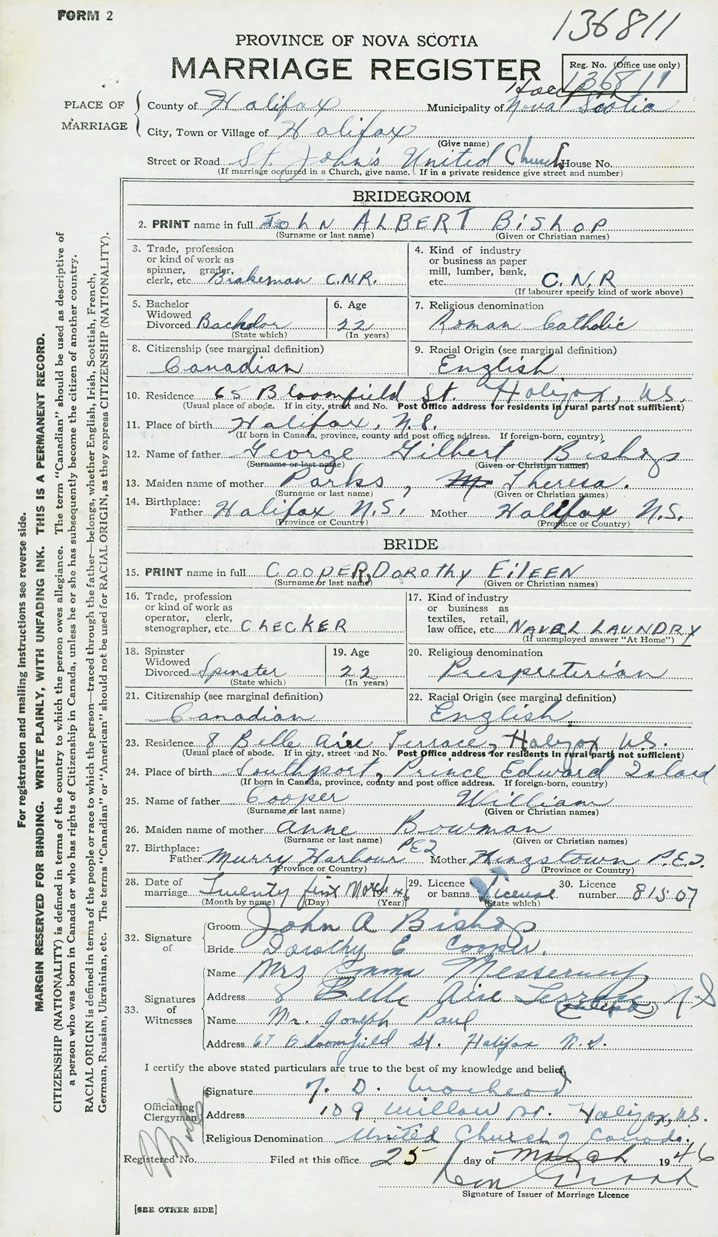 28. Date of marriage March 21 1946 29. By license or banns License 30. License number 81507