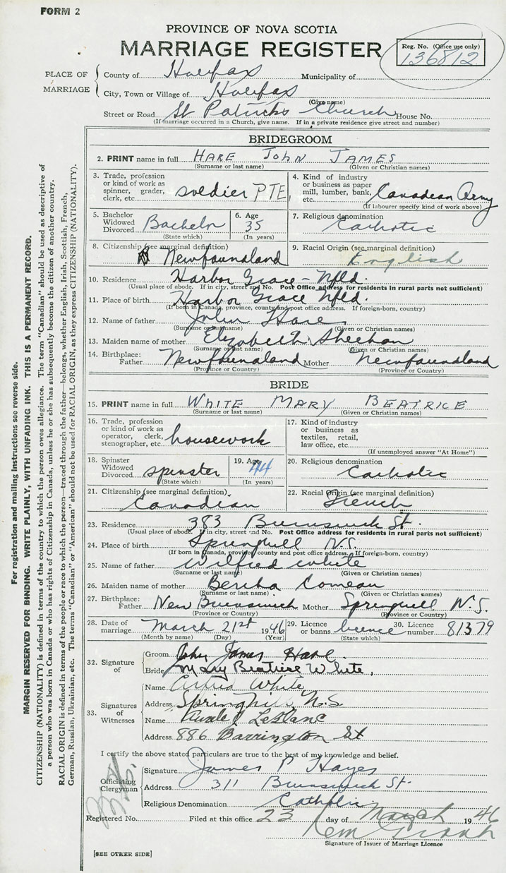 28. Date of marriage March 21 1946 29. By license or banns License 30. License number 81379