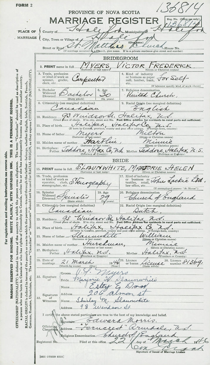 28. Date of marriage March 21 1946 29. By license or banns License 30. License number 81369