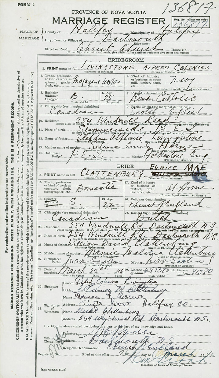 28. Date of marriage March 22 1946 29. By license or banns License 30. License number 81380