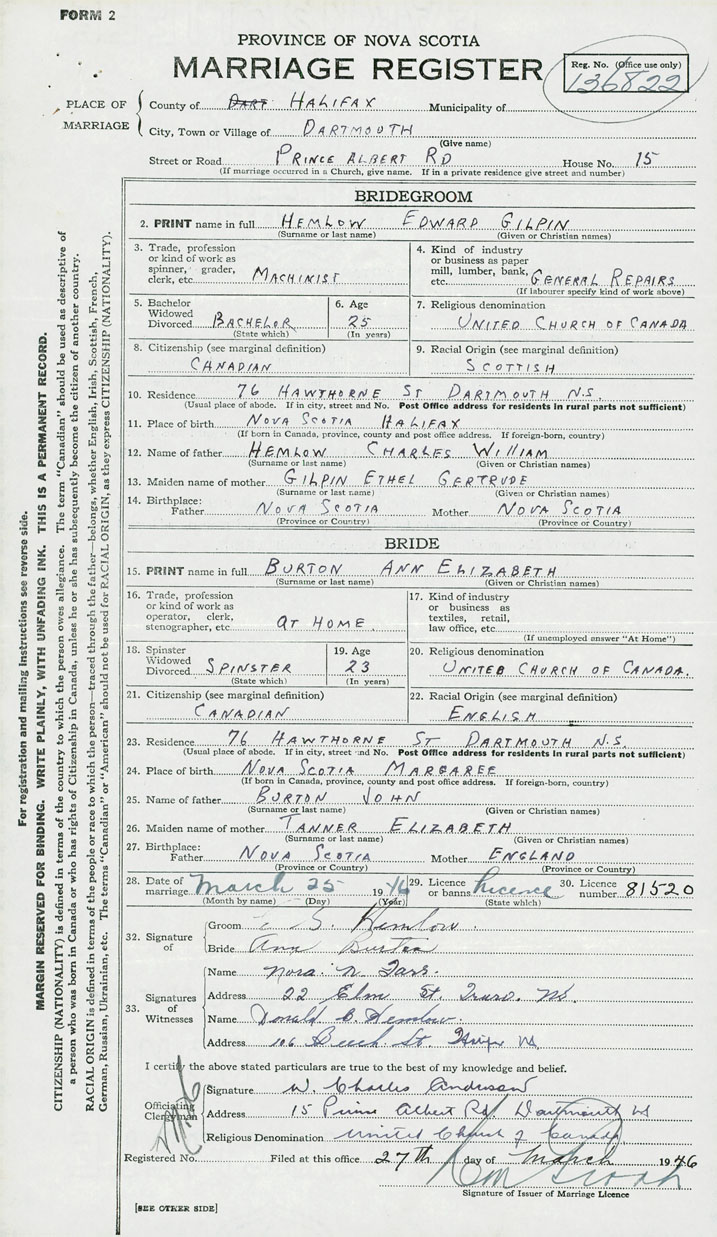 28. Date of marriage March 25 1946 29. By license or banns License 30. License number 81520