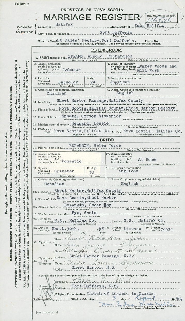 24. Place of birth Sheet Harbor, Halifax Co
