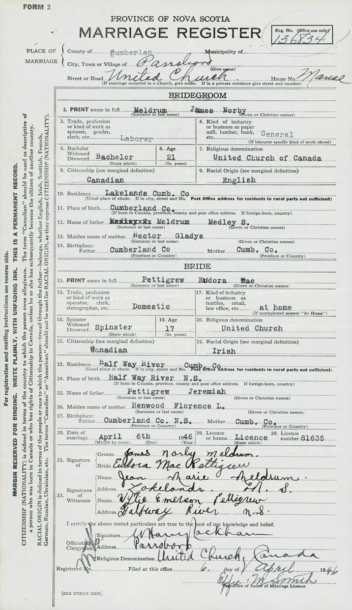28. Date of marriage April 6 1946 29. By license or banns License 30. License number 81635