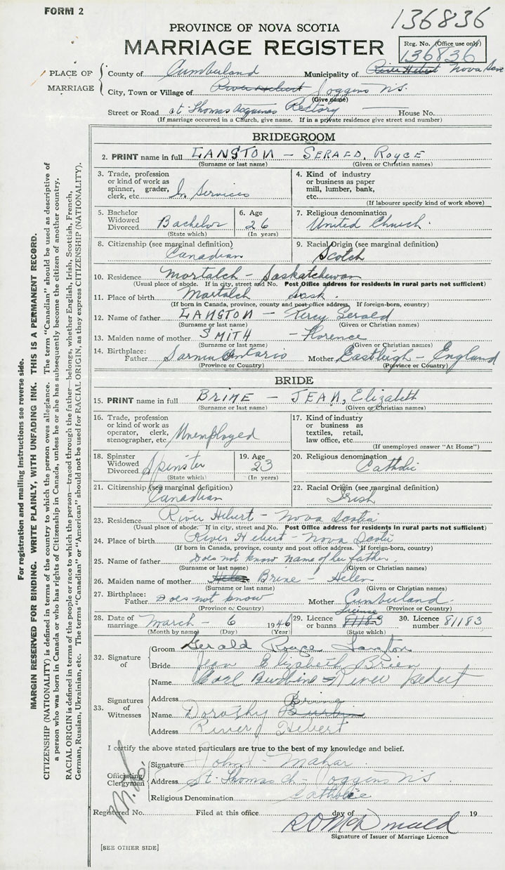 28. Date of marriage March 6 1946 29. By license or banns License 30. License number 81183