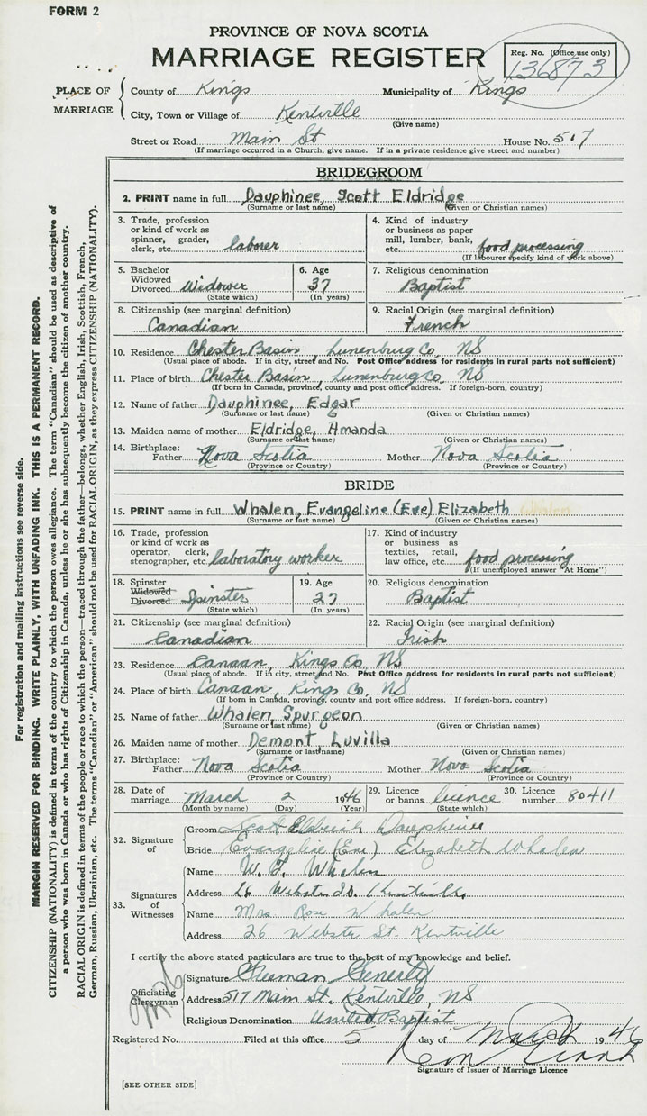 28. Date of marriage March 2 1946 29. By license or banns License 30. License number 80411