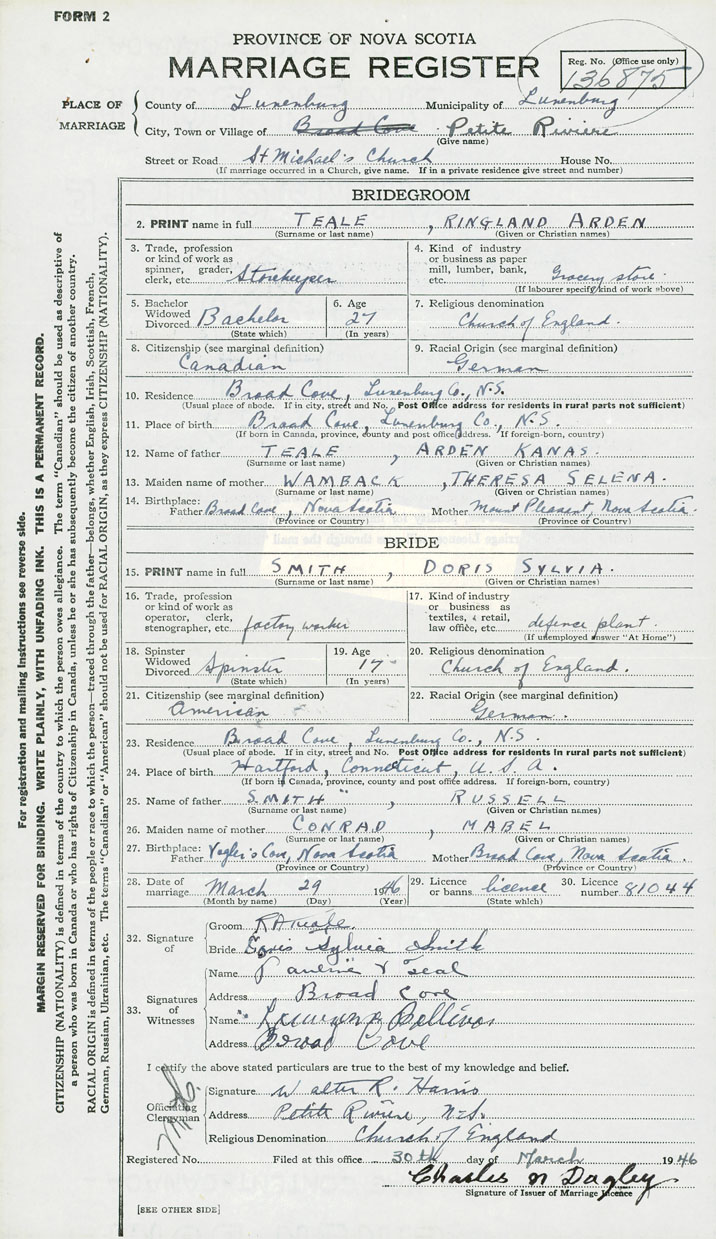28. Date of marriage March 29 1946 29. By license or banns License 30. License number 81044