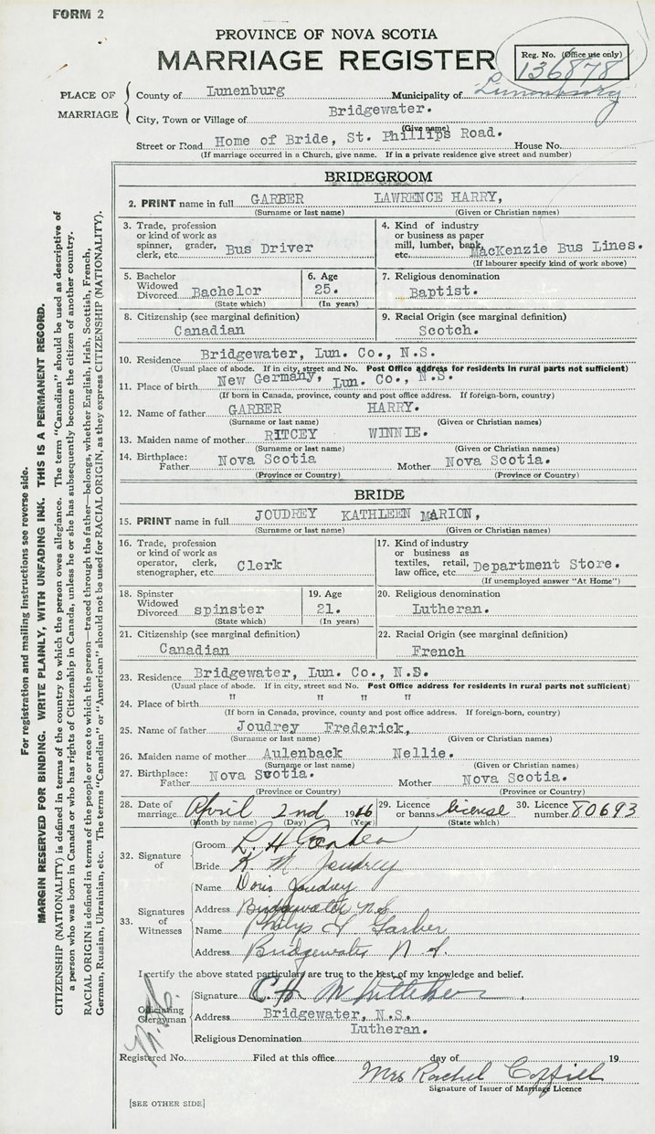 24. Place of birth Bridgewater, Lunenburg County