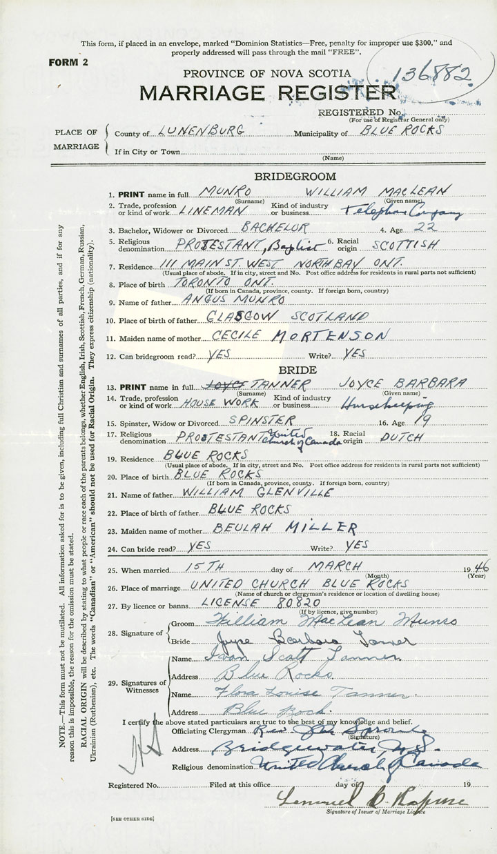 PLACE OF MARRIAGE County of Lunenburg in City or Town Blue Rocks