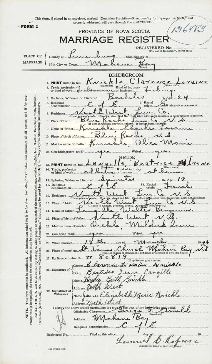 PLACE OF MARRIAGE County of Lunenburg in City or Town Mahone Bay