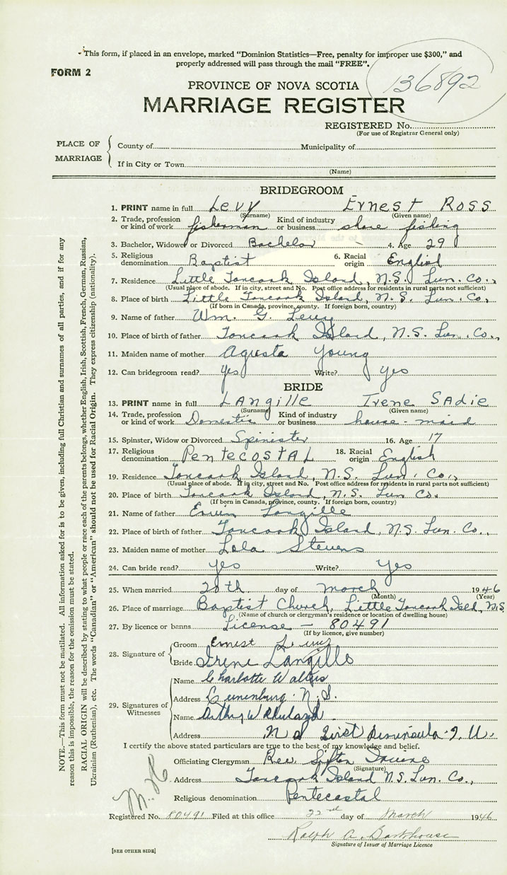 PLACE OF MARRIAGE County of Lunenburg in City or Town Little Tancook Island