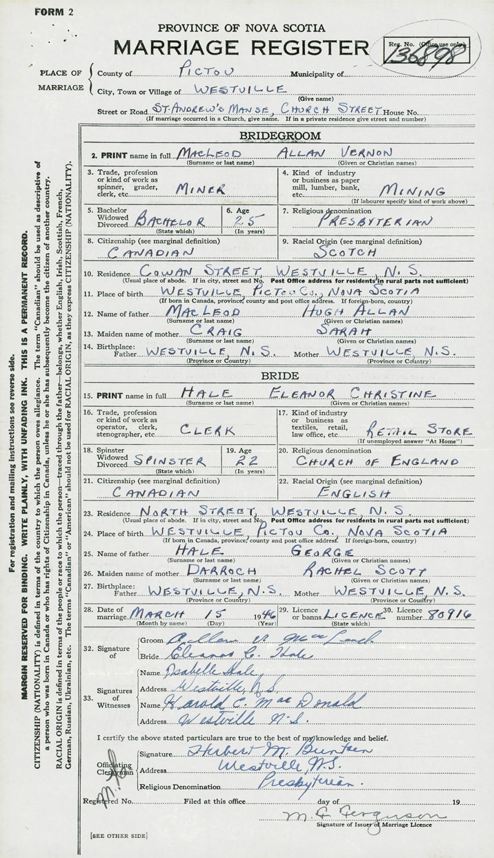 28. Date of marriage March 15 1946 29. By license or banns License 30. License number 80916