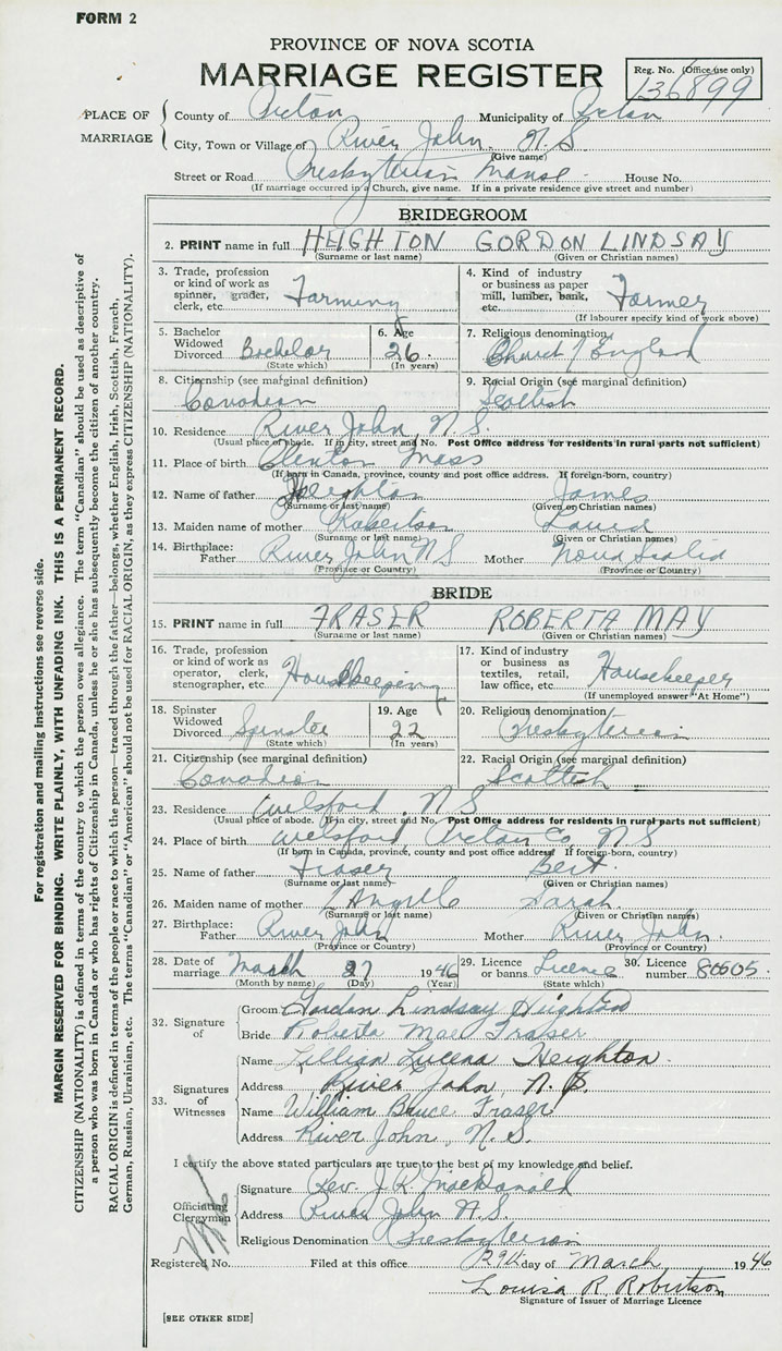 28. Date of marriage March 27 1946 29. By license or banns License 30. License number 80505